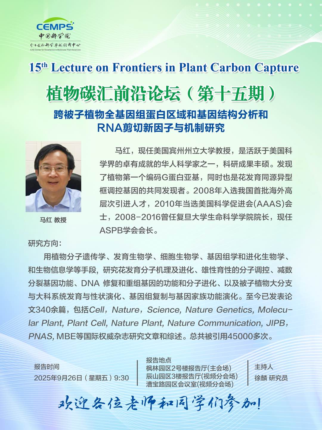 植物碳汇前沿论坛(第十五期)--跨被子植物全基因组蛋白区域和基因结构分析和RNA剪切新因子与机制研究